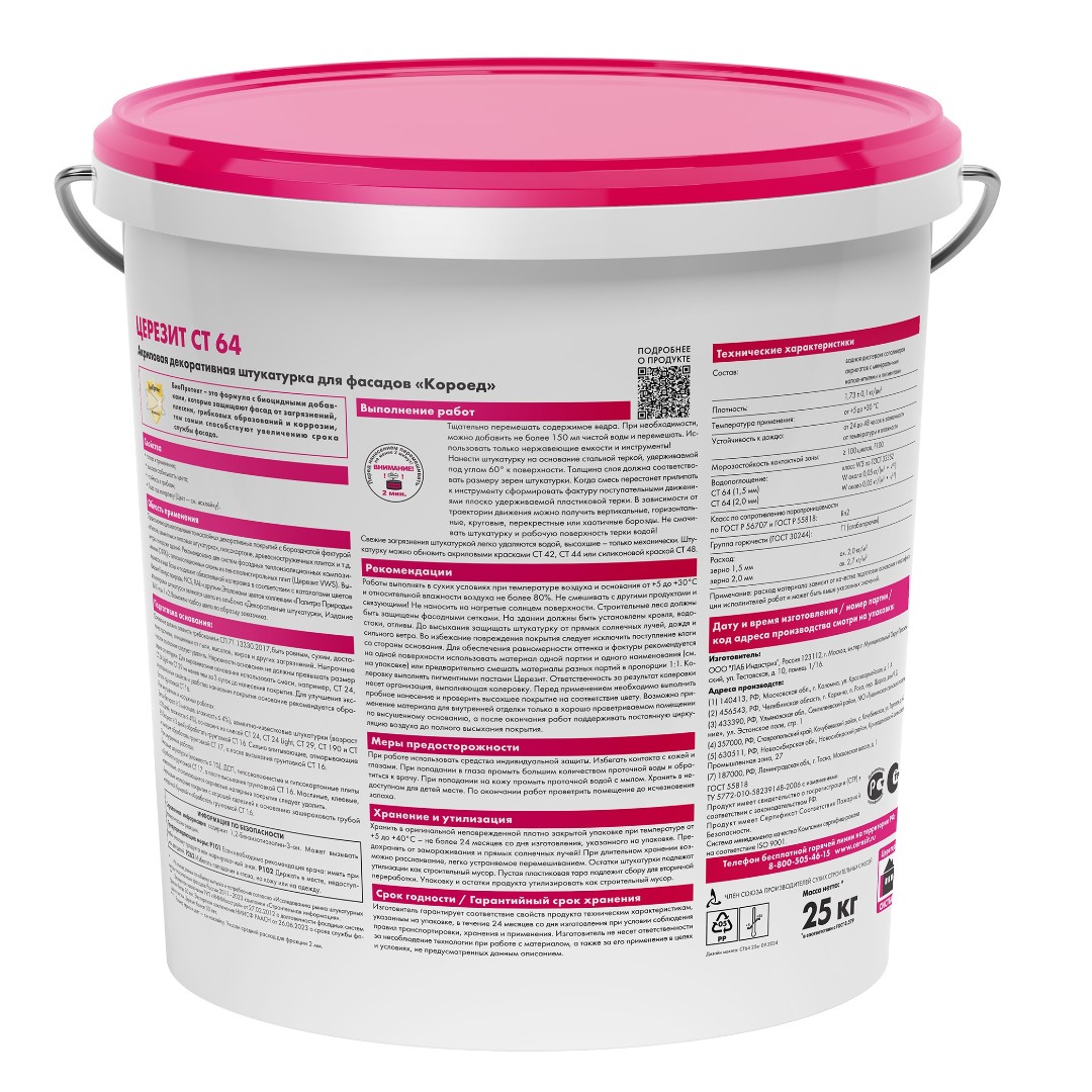 Штукатурка СТ 64/25- декоративная штукатурка, предназначенная для создания декоративных покрытий с зернистой фактурой. Образует прочные, эластичные и долговечные покрытия, способные перекрывать мелкие трещины, и рекомендована для декоративной отделки фасадов зданий, в т.ч. в регионах с частыми и интенсивными атмосферными осадками, стен вестибюлей, холлов, лестничных клеток и так далее.